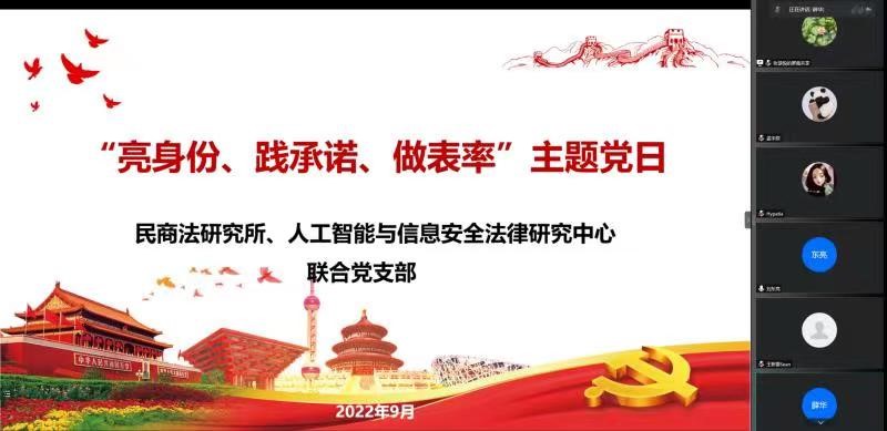 9月28日,乐动在线平台民商法研究所、人工智能和信息安全法律研究中心联合党支部开展“亮身份、践承诺、做表率”主题党日活动。活动通过线上形式举行,由支部书记薛华主持。