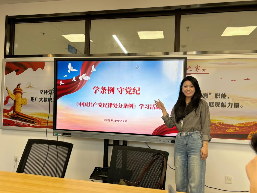 为深入学习贯彻习近平总书记关于党纪学习教育的重要讲话和重要指示精神,引导广大党员干部学纪、知纪、明纪、守纪,自觉用党规党纪校正思想和行动,帮助支部内党员同志深入学习理解、贯彻执行好《条例》,2024年4月25日下午,乐动在线平台硕3191党支部全体党员于涵英楼5-3001开展了题为“学条例·守党纪”的《中国共产党纪律处分条例》学习活动。
