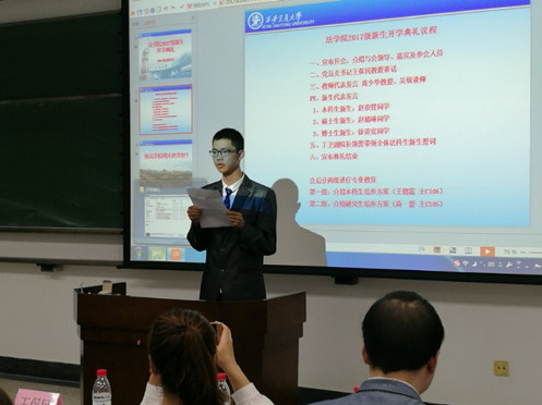 在新生代表的发言环节,本科新生赵崇智同学回顾高中及入校的军训生活,对即将开始的大学生活展开憧憬。立志紧跟时代步伐,践行唐文治先生“须知吾人欲成学问,当为第一等学问;欲成事业,当成第一等事业;欲成人才,当为第一等人才;而欲成第一等学问、事业、人才,必先砥砺第一等品行”的要求,做青年之楷模。硕士新生赵婧琳同学首先向老师们表达了教师节的祝福,接着她结合自己的成长经历,强调我们要牢记“精勤求学、敦笃励志、果敢力行、忠恕任事”的校训,时刻不忘向老师学习,踏实做事,胸怀坦荡,立志做时代的英才;潜修法律,解民生之艰。硕士毕业于英国格拉斯哥大学的博士新生徐济宽结合自己在国外求学的见闻,给学弟学妹们介绍了法律人的三个职业发展道路—律师、法官、研究人员,以及自己实习经历与感触。