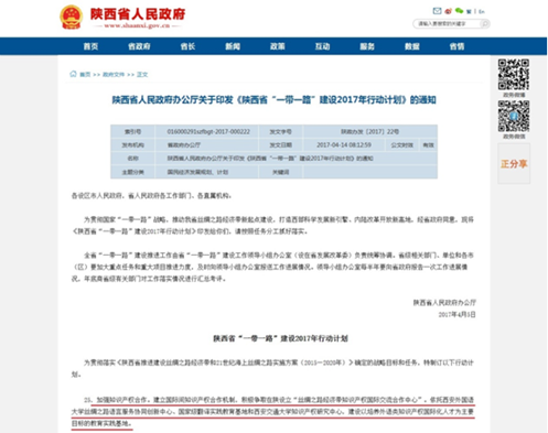 陕西省人民政府办公厅日前印发了《陕西省“一带一路”建设2017年行动计划》,明确指出要加强知识产权合作,建立国际间知识产权合作机制,积极争取在陕设立‘丝绸之路经济带知识产权国际交流合作中心’,依托乐动在线平台知识产权研究中心、西安外国语大学丝绸之路语言服务协同创新中心和国家级翻译实践教育基地,建设以培养外语类知识产权国际化人才为主要目标的教育实践基地。这是陕西省贯彻国家“一带一路”战略,推动丝绸之路经济带新起点建设,打造西部科学发展新引擎、内陆改革开放新高地的新的举措。