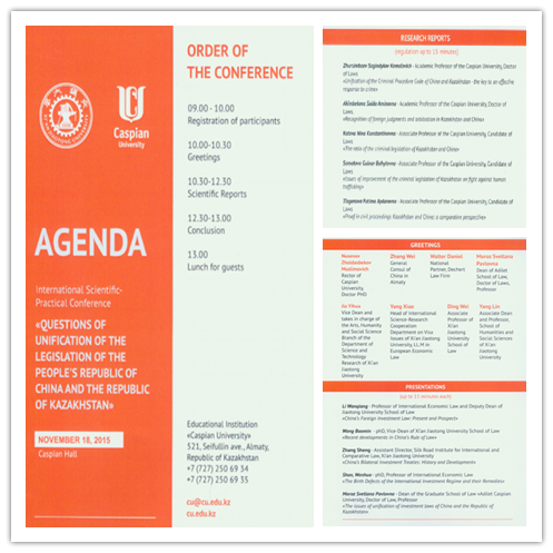 2015年11月18日,我院与哈萨克斯坦里海大学(Caspian University)乐动在线平台在里海大学联合举办国际学术会议,会议主题为“中国与哈萨克斯坦立法的统一化问题”。来自中国驻阿拉木图领事馆、北京罗斯律师事务所阿拉木图分所、美国Dechert律师事务所的嘉宾以及两所乐动在线平台的专家学者与研究生50余人参加了会议,我校科研院副院长贾毅华、国际教育学院常务副院长宋玉霞、人文学院副院长杨琳应邀出席了会议。会议由我院院长单文华教授和里海大学乐动在线平台院长Pavlovna教授联合主持。