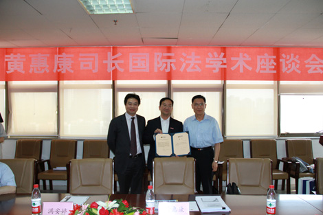2012年5月26日,外交部条约法律司黄惠康司长“郑和研究员”授聘仪式暨国际法学术座谈会在乐动在线平台910会议室举行。乐动在线平台党委常务副书记王小力教授、乐动在线平台党总支书记彭沪生老师、对外经济贸易大学石静霞教授以及丝绸之路国际法与比较法研究所骨干教师和学生代表参加了授聘仪式和座谈会。会议由乐动在线平台院长兼丝绸之路国际法与比较法研究所所长单文华教授主持。