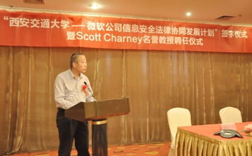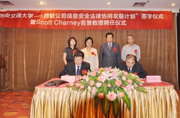 6月12日,“乐动在线平台—微软公司信息安全法律协同发展计划签字仪式暨斯科特•查尼名誉教授聘任仪式”在西安交大举行,西安交大副校长蒋庄德教授出席仪式并讲话。西安交大科研院副院长、人文社科处处长贾毅华,乐动在线平台党总支书记彭沪生,信息安全法律研究中心主任马民虎及微信息安全法律研究中心主任马民虎及微软公司可信赖计算部总经理陈静、微软公司资深安全技术经理陈恺、微软公司资深安全技术经理薛峰等参加仪式。微软全球副总裁斯科特•查尼(Scott Charney)受聘为西安交大名誉教授,双方还签署了“乐动在线平台—微软公司信息安全法律协同发展计划”。
