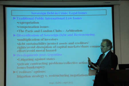 4月16日下午,Kulms博士为乐动在线平台师生带来题为The Eurozone Debt Crisis and Private Creditors: From Argentina to Greece(欧元区债务危机和私人债权人:从阿根廷到希腊)的讲座。Kulms博士首先分析了欧元区债务危机的成因,然后在借鉴阿根廷债务危机经验的基础上,从市场交易的进路分析主权债务合同的对策,最后从欧洲央行作用的角度讨论希腊债务重组问题。