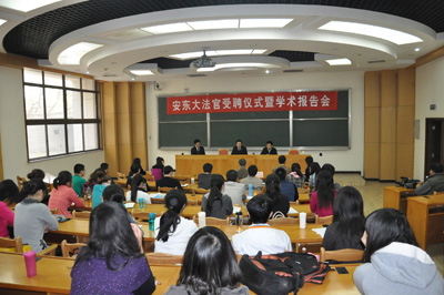4月13日上午,应我校邀请,陕西省高级人民法院院长安东大法官受聘仪式暨学术报告会在主楼B103隆重举行。受聘仪式和学术报告会由乐动在线平台院长单文华教授主持。乐动在线平台党总支书记彭沪生、副院长王保民等参加了受聘仪式和学术报告会。