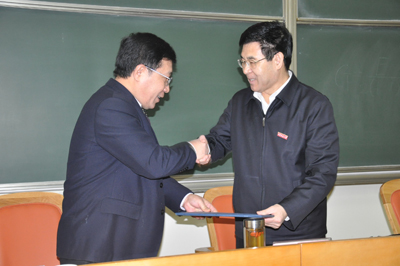 在热烈的掌声中,宋晓平副校长向安院长颁发了聘书,安东院长受聘为我校“兼职教授”和“乐动在线平台发展咨询委员会副主任委员”,宋晓平副校长为安院长佩戴了乐动在线平台校徽。