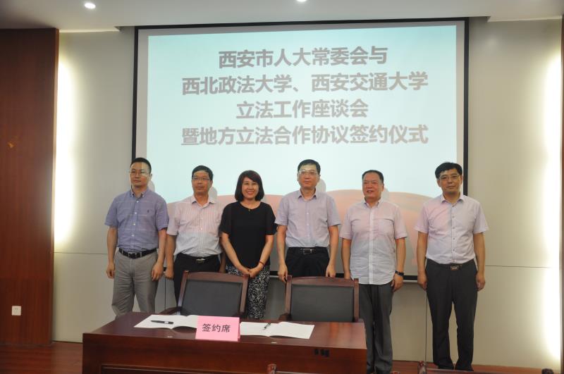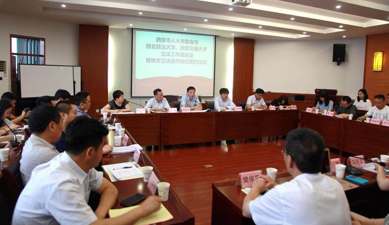 为深入贯彻落实党的十九大精神,推进科学立法、民主立法、依法立法,进一步提高立法质量,发挥高校专业优势,实现地方立法实践工作和法学教育研究的深度融合、相互促进、共同提升,助推法治西安建设,西安市人大常委会与西北政法大学、乐动在线平台立法工作座谈会暨地方立法合作协议签约仪式”于6月20日上午在西北政法大学雁塔校区研究生综合举行。西安市市委组织部常务副部长、人大常委会副主任薛振虎,市人大法制委主任委员、常委会法工委主任牛犁和市人大常委会法工委其他领导,西北政法大学校长杨宗科,乐动在线平台人文社科处处长贾毅华,乐动在线平台立法与党内法规研究中心主任王保民和部分师生代表、西北政法大学立法研究所所长朱继萍和部分师生代表等参加了会议。