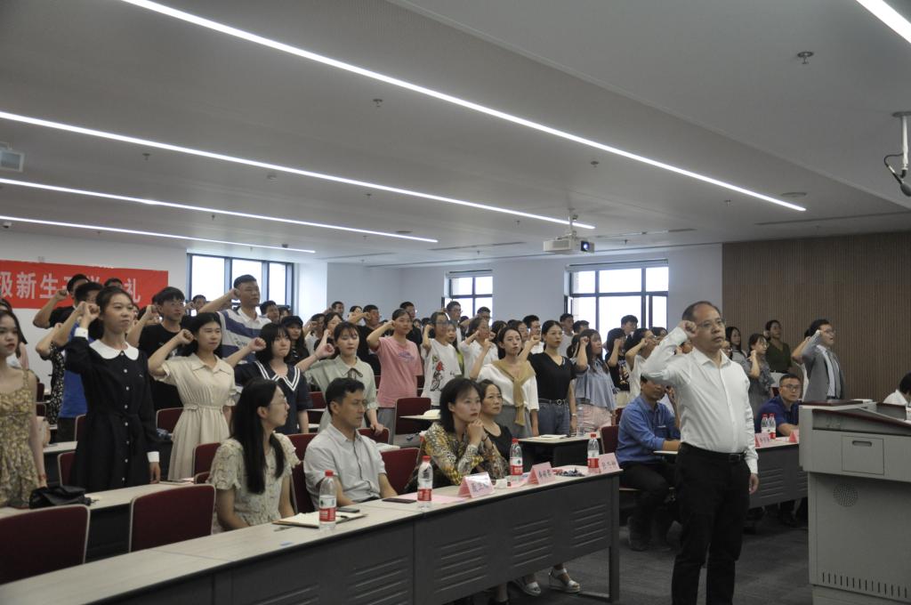 最后,全体新生在丁卫副院长的带领下庄重誓言:“公平所系,正义相托。在这庄严时刻,我郑重宣誓:我自愿投身法治事业,忠实履行一个法律人应尽的全部义务,恪守宪法,热爱祖国,忠于人民,弘扬法治精神,维护正当权益,勤勉诚信,清正廉洁。我决心竭尽全力,捍卫法律职业的圣洁与荣誉,养天地正气,行人间正道,求正义,尚卓越,为法治中国的繁荣发展和人类正义的美好未来奋斗终身!”