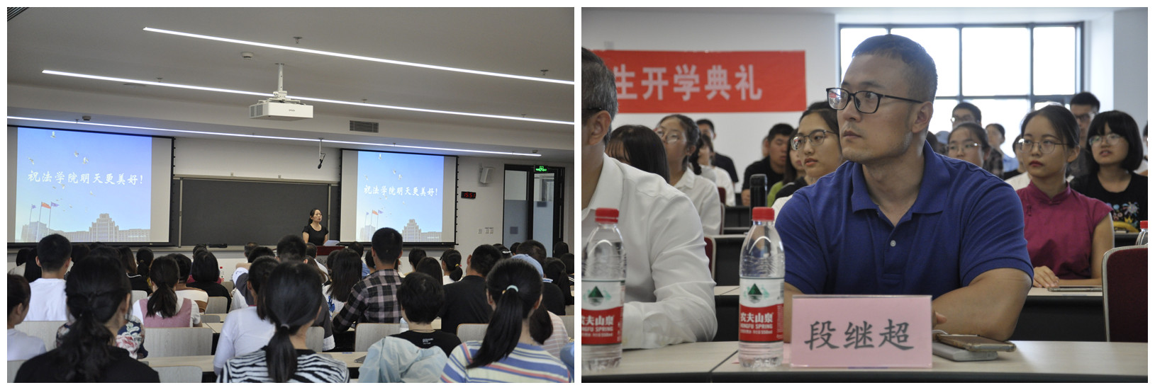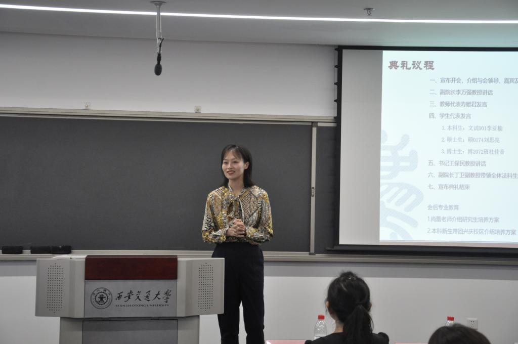 在新生代表的发言环节,本科新生李亚楠同学畅谈了初入大学校园的感触和对未来大学生活的新期望;硕士生代表刘思亮同学围绕社会责任与担当,向全体新生发出了努力为法治之光的号召;博士生代表杜佳音同学则结合自己的科研与工作经历,表达了对于求实求学和科研攻关的坚定决心。