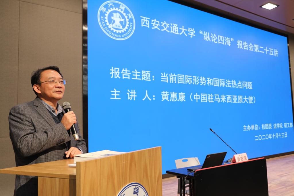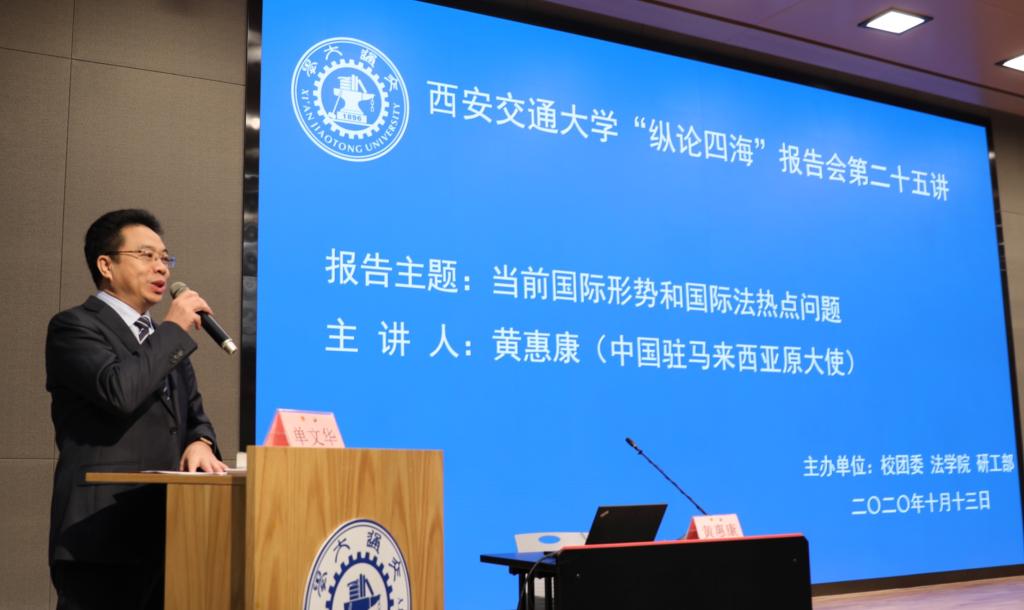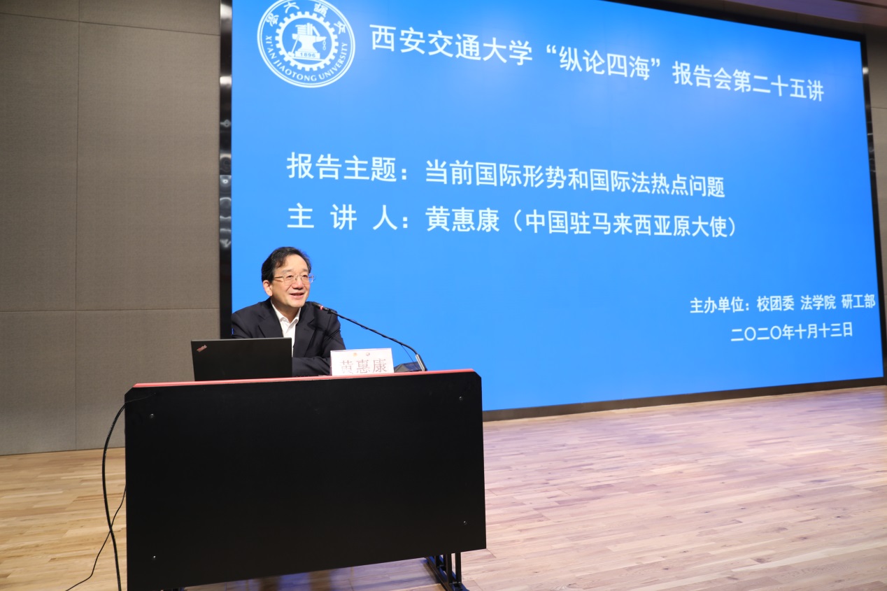上午9:30分,黄惠康大使主讲的 “当前国际形势与国际法热点问题”专题报告会在新港报告厅举行。本次报告会是乐动在线平台“纵论四海”系列高端报告会的第二十五讲,同时是学校党委理论学习中心组和全体校管干部的一次集中辅导报告会,亦是我校法学研究院特别是丝绸之路国际法与比较法研究所和丝绸之路经济带法律政策协同创新中心的“科创月”系列活动之一。乐动在线平台副校长席光教授出席报告会并致辞,报告会由乐动在线平台院长兼国际教育学院院长单文华教授主持。全校百余名学校正处级领导干部以及其他四百余名师生现场参会。同时,全校其他副处级以上校管干部则在线参加了报告会。