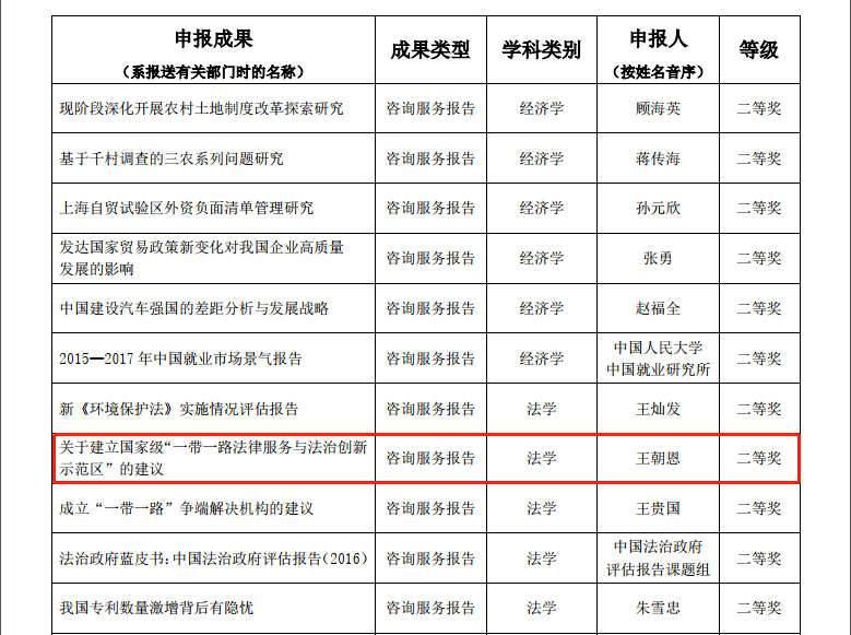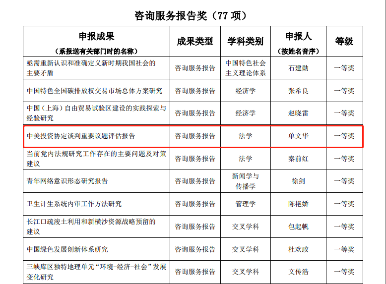 其中,乐动在线平台院长单文华教授主持撰写的《中美投资协定谈判重要议题评估报告》荣获咨询服务报告类一等奖——这是该类型全国仅有的两项法学类一等奖获奖成果之一,也是西安交大在该奖项一等奖上的首次突破。同时,由单文华院长和王朝恩副教授等合作撰写的《关于建立国家级“一带一路法律服务与法治创新示范区”的建议》荣获咨询服务报告类二等奖,是全国5项法学类二等奖成果之一。