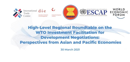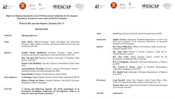 2021年3月30日下午,“WTO投资便利化促进发展谈判区域高层圆桌会议:亚太经济体的视角”在泰国曼谷成功举行。乐动在线平台乐动在线平台院长单文华教授应邀参加并作“WTO投资便利化谈判所面临的挑战”的大会发言。此次会议由联合国亚洲及太平洋经济社会委员会(亚太经社会ESCAP)和世界经济论坛(WEF)、联合国国际贸易中心(ITC)、德国发展研究院(DIE)、东南亚国家联盟(东盟ASEAN)联合举办,参加会议的包括亚太地区各国商务部长、驻WTO大使、主要相关国际机构代表、投资促进和私营部门代表以及本领域的领军学者代表。会议的主旨是为争取WTO投资便利化谈判在年内取得重大进展加强共识。