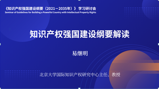 开幕式结束后接续了本次研讨会的第一模块:《知识产权强国建设纲要(2021—2035年)》重点内容解读,孙那副教授主持,易继明教授以《知识产权强国建设纲要解读》为题做了精彩报告,马治国教授进行了点评和补充。