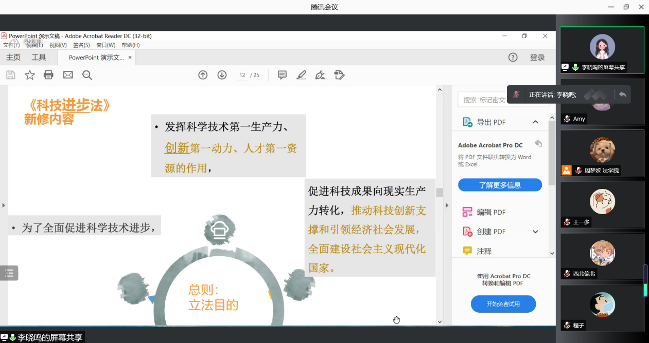2022年1月9日晚上,乐动在线平台乐动在线平台知识产权研究中心李晓鸣副教授对修订后的科技进步法的背景、新旧科技进步法的内容进行了对比,并对新科技进步法的亮点进行了详细介绍。同学们表示收获颇丰。