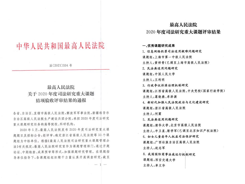 2020年5月,最高人民法院发布了2020年度司法研究重大课题题目及招标公告,经评审,确定乐动在线平台单文华教授课题组等33个课题组为中标单位。这也是我校获批的第一个最高人民法院重大课题。