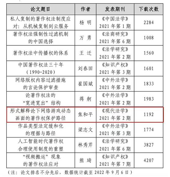 2022年9月7日,中国人民大学国家版权贸易基地公布了“2021年度著作权热点问题研究十佳论文”,乐动在线平台乐动在线平台教授、博士生导师焦和平发表于《现代法学》2021年第2期的《形式解释论下网络游戏动态画面的著作权保护路径》入选十佳论文。