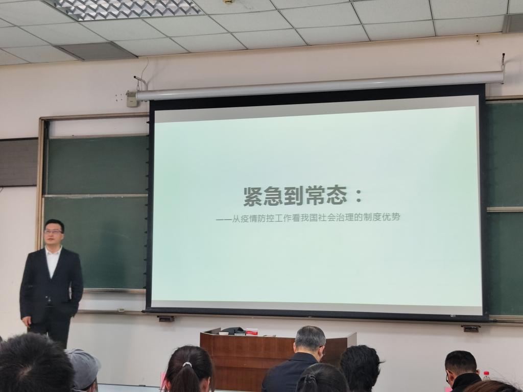 葛峰检察长对习近平总书记在疫情防控中的一系列指示进行深入解读,结合自己在疫情防控期间参与社区防控的六点防疫思考及其理解的基层社会治理逻辑与在座师生分享。在谈到传统社会治理的特征时指出,乡村社会治理的本质是去复杂性的,与城市社会治理存在很大差别。他特别强调党建引领在基层社会治理中的重要性,疫情防控期间党员敢担当,肯作为,冲锋在前。他引用曾国藩“愈是军情棘手,众议纷纭,余姚心明力定,从‘耐烦’二字痛下功夫”的名言勉励同学们,要保持战略定力,做情绪稳定、耐得住寂寞的青年。