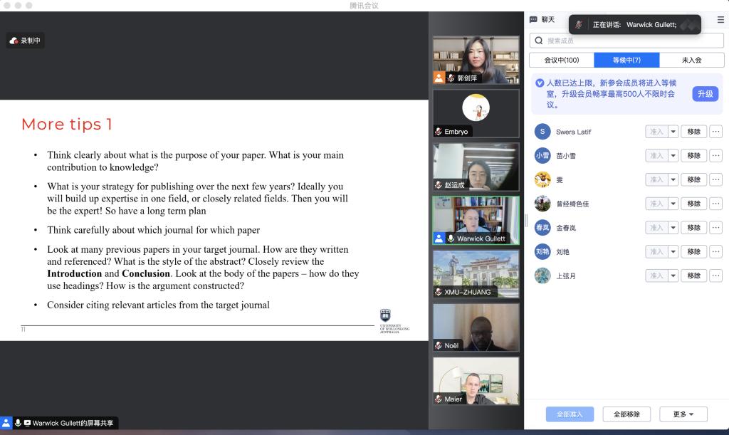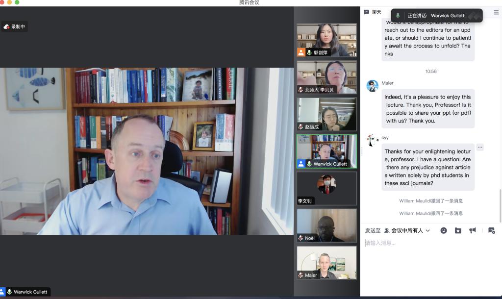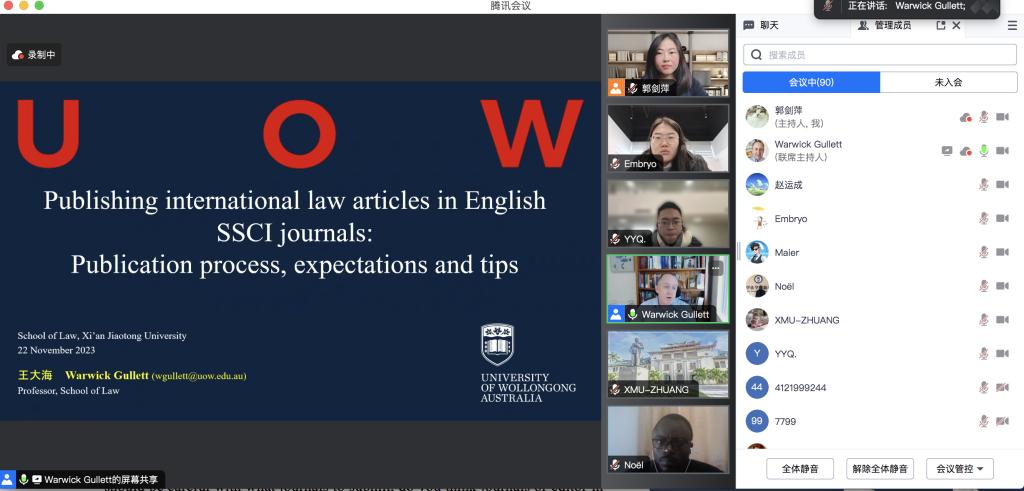 2023年11月22日9:30,澳大利亚伍伦贡大学乐动在线平台、国家海洋资源与安全中心(ANCORS)Warwick Gullett教授在腾讯会议为我院师生线上带来一场题为“Publishing International Law Articles in English SSCI Journals: Publication Process, Expectations and Tips”的主题讲座。讲座由乐动在线平台乐动在线平台副教授郭剑萍主持,乐动在线平台部分博士生、硕士生以及来自其他学院的师生参加了此次讲座。