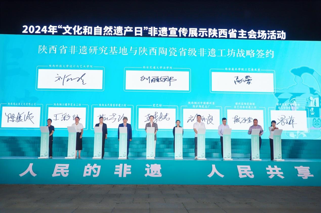 在启动仪式上,乐动在线平台、西安美术学院、陕西科技大学三家陕西省非物质文化遗产研究基地与7家陕西陶瓷省级非遗工坊(铜川市耀州窑唐宋陶业有限公司、铜川市印台区东方古镇陶业有限公司、陕西铜川中国耀州窑陈炉陶瓷总厂、陕西火凤凰耀州官窑有限公司、陕西五代柴窑文化科技发展有限公司、陕西铜川耀华瓷业有限公司、陕西鸿运来文化有限公司)签订战略合作协议。