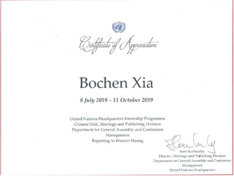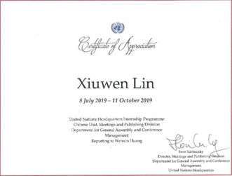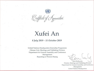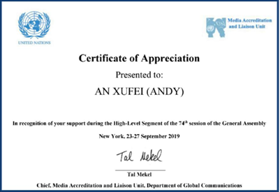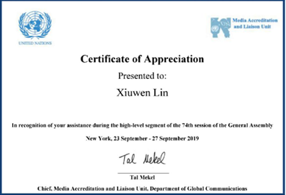 实习期间正值第74届联合国大会的召开,我校三名实习生有幸承担了联合国秘书长工作报告中文译本的编校工作,并通过了联合国全球传播部的选拔成为本届大会的志愿者,荣获“优秀志愿者证书”。乐动在线平台博士生夏伯琛感言:“终于有机会可以为祖国做一点力所能及的事,我们会主动引导前来参会的中国代表和媒体到达指定会场。最激动人心的是现场聆听国务委员王毅和联合国秘书长古特雷斯在新中国成立七十周年成果图片展开幕式上的致辞,向世界各国友人分享中国发展进步的辉煌成就。作为一名中国志愿者,强烈的民族自豪感油然而生!”