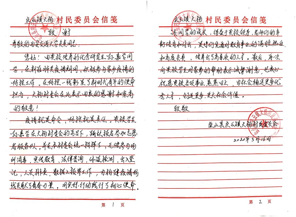 近日,一封特殊的来信悄然落至交大。西交乐动在线平台学生——孙嘉学在家乡疫情防控攻坚战中不仅身体力行做好各项基础工作,更发挥自身专业为群众普及相关法律知识,为控制疫情贡献青春力量。庆云镇大杨村特向乐动在线平台邮寄了一封手写感谢信,字里行间饱含对交大领导、老师的真挚谢意。