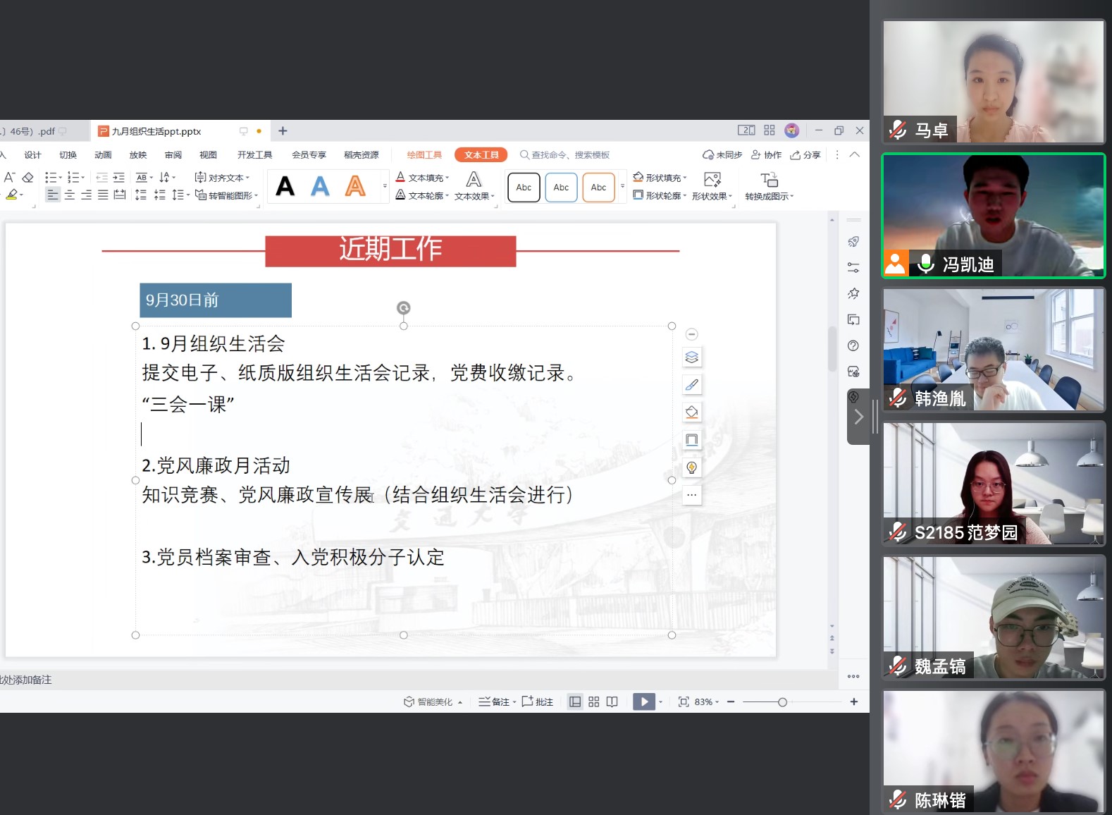 2022年9月27日晚,乐动在线平台硕2185党支部举行了九月组织生活会,也是本支部的第一次会议。根据疫情防控相关要求,本次组织生活会采用线上的方式进行。本次会议由党支部书记冯凯迪主持,党员及入党积极分子共15人参加会议。